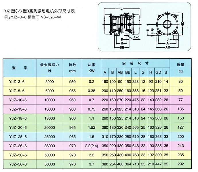 YJZ是我廠在VB系列振動(dòng)電機(jī)基礎(chǔ)上的又一新型產(chǎn)品,YJZ系列振動(dòng)電機(jī)和VB系列振動(dòng)電機(jī)地腳安裝尺寸基本相似,但是外形尺寸稍有不同??蛻粼谶x購的時(shí)候也可以互相參考。
