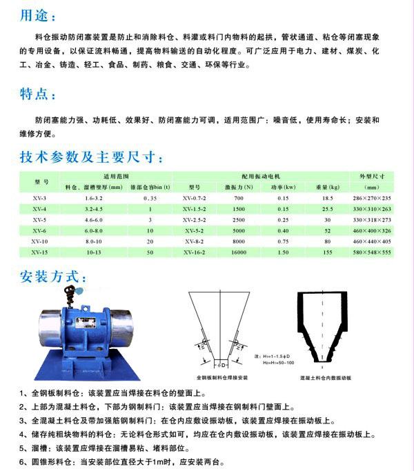 咨詢熱線:15544296999 XV系列倉(cāng)壁振動(dòng)器(防閉塞裝置)能力強(qiáng),體積小、功耗低,結(jié)構(gòu)簡(jiǎn)單,激振力無(wú)極調(diào)節(jié),適用范圍廣,噪音低,壽命長(zhǎng)、安裝使用方便等特點(diǎn)。